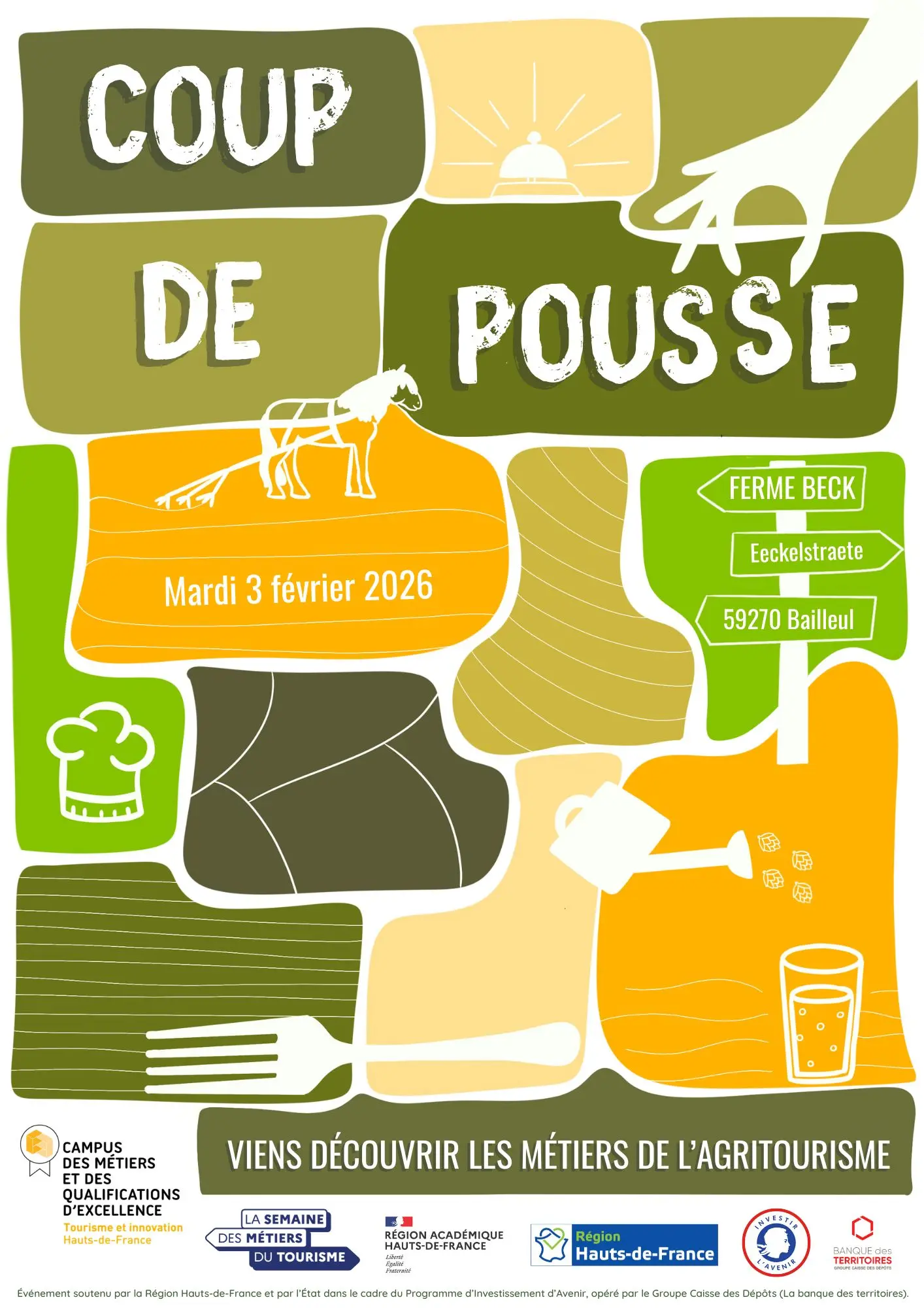 Organisé à la Ferme de Beck à Bailleul, l’événement sera dédié à l’agritourisme et sera en partie animé par les apprenants du Lycée Ile de Flandre d’Armentières. Les participants (collégiens et lycéens de nos établissements membres), découvriront ainsi le lien entre agriculture, alimentation et tourisme à travers une découverte des circuits de la bière et du lait et une dégustation d’un en-cas préparé avec des produits du terroir.